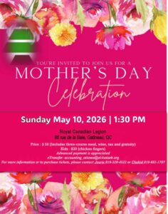 Home Events Kataeb Ottawa Mother’s Day Celebration Kataeb Ottawa Mother’s Day Celebration + Add to Google Calendar + iCal / Outlook export Date May 10 2026 Time 1:30 pm Local Time Timezone: America/New_York Date: May 10 2026 Time: 1:30 pm