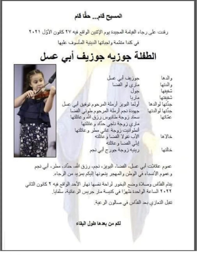 Funeral service will be held on Thursday January 6, 2022, at 10:00am at St. Charbel Church, 245 Donald Street, Ottawa.